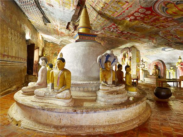 Zlatý chrám Dambulla – týchto päť zložitých skalných chrámov, za veľkým zlatým Budhom sú ľahko dostupné zo Sigiriye. V tmavom svetle je miestami ťažké vidieť aké krásne je toto umelecké dielo.