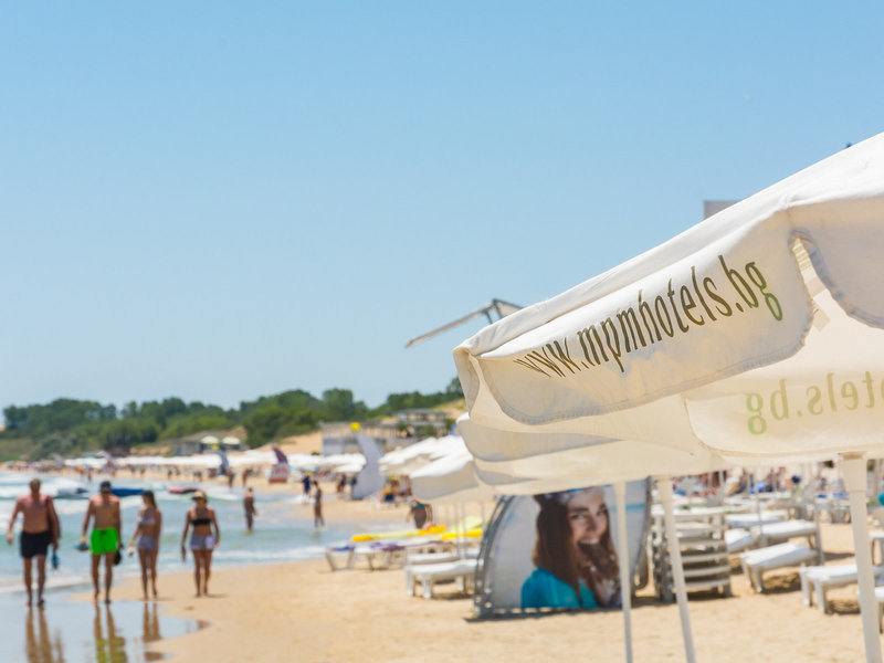 - Pláž: piesková, verejná s vlastnou hotelovou časťou, ležadlá: zdarma, slnečníky: zdarma