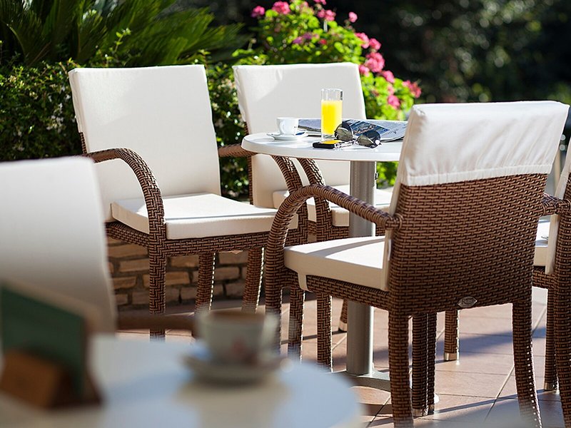 Sport & Fitness: Auf der Terrasse können die Urlauber schönes Wetter genießen. Abwechslung bieten verschiedene Angebote, darunter Radfahren/Mountainbiking, Tennis, Reiten, ein Fitnessstudio und ein Spa.