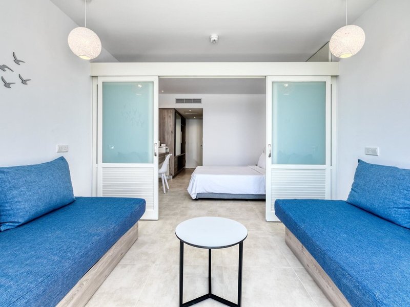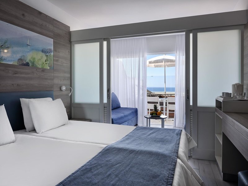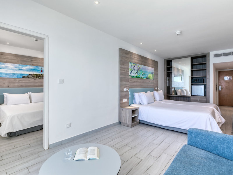 - Superior Family Room Sea View (DZM2), Familienzimmer, im Hauptgebäude, Meerblick, Blick auf SEA, ca. 27 m², optisch abgetrenntes Kinderzimmer, 2 Einzelbetten, 2 Schlafsofas, Klimaanlage: zentral gesteuert, Heizung: zentral gesteuert, Fußboden: Fliesenboden, Safe: ohne Gebühr, Kühlschrank, Kaffee-/Teezubereiter, Wasserkocher, Telefon, Fernseher: Flatscreen, Reinigungsservice, Dusche, Balkon: mit Liegestühlen